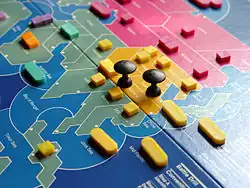Oil, Minerals, and Grain are the three resources in the game. Players draw resource cards on the prospect stage to determine which mines, farms, and oilfields they control, they can only control resources in other superpower territories if they have invaded and occupied said territory. This ignites many conflicts because players need resources to build and move military units, fight battles, and control the population, earn money on the "Sell to Market" stage, upgrade their technology, and defend their country. Each superpower may control up to twelve units of each resource, if they defeat and subsequently occupy an enemy superpower they can take control of their supply center and have up to 24 of each resource. Additional units may be sold on the world market.