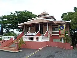 A surau is an Islamic assembly building in some regions of Sumatra and the Malay Peninsula, used for worship and religious instruction. Generally smaller physical structures, their ritual functions are similar to those of a mosque, they admit men and women, and they are used more for religious instruction and festive prayers. Surau mostly depend on grassroots support and funding and can be compared to the Arab zawiya.[2] In the Minangkabau society of West Sumatra, Indonesia, they are built on high posts and maintain pre-Islamic traditions of a men's house.[3]