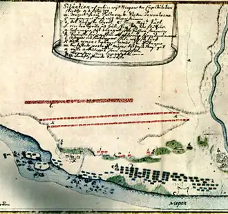 The dawn of the next morning brought news that a Russian corps of infantry, cavalry and artillery was deployed in a crescent shape, ready for battle, on the plateau above the river, about 9,000 men under the command of General Menshikov.[2]: 231 The Cossacks, allied with the Russians, swept down to plunder the Swedish wagons.[2]: 233 The Russian army advanced and blocked the road to Kishenka and a Swedish escape.[2]: 233 The Swedish army now faced the sandhills and the Russian army on the plateau.[2]: 234
