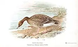 The species was first described by Professor Petr Sushkin in 1897 based on eight specimens obtained from wintering grounds in Bashkiria.[1] Large numbers were known to winter near Tashkent and Hortobágy in eastern Hungary. Nearly 150,000 were known to winter in Hungary between 1908 and 1911.[2] It had a distinctive double-note “Gé-gé” call, and differed in the size of its bill and its colouration. The feet were pink and the mid portion of the bill was fleshy or rosy, unlike orange in bean geese. The sizes were closer to Anser fabalis rossicus. It was considered as a valid species[3] until it was downgraded by Johansen in 1945. As much of the literature on the species has not been in English, it has largely been ignored. The last known living birds were in the Budapest zoo in 1934. Individuals of Anser serrirostris and Anser fabalis with similar bill colours have been reported which might suggest that the species formerly interbred at the edges of its breeding range.[4][5][6] [7][8][9]