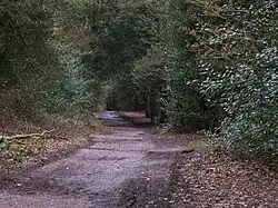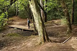 Peat-cutting, near Rowton's Well during World War II, recovered flint arrowheads at the base of the peat. There are some unassuming prehistoric burnt mounds, and an ancient well. The park contains a preserved section of the Icknield Street, a Roman road; the noticeably cambered road enters the Park near the Royal Oak Gate and exits towards the aptly named Streetly, the "meadow by the paved street";[2] it is still possible to walk the road. In 1909, two Roman coins were discovered in the park. The Queen's Coppice, planted in 1953, now covers the site of an ancient tumulus, from which a stone 'coffin' was dug out by antiquarians in 1808. Near Blackroot Pool are the earthworks of an ancient encampment, the origin of this is not known – possibly it was a hunting lodge and it may have been Roman, Mercian or Norman (or even all three, over time).