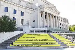 In October 2013, Lacy organized conversations among women on the stoops of Park Place houses in Brooklyn, New York, for her Between the Door and the Street Project. Sponsored by the Brooklyn Museum's Elizabeth A. Sackler Center for Feminist Art, 360 participants discussed gender issues while passersby listened in.[25]