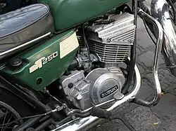 The T250's engine was a development of the earlier T20, which had been introduced in 1966. The 180° piston ported two stroke twin was of unit construction and had alloy head and alloy barrels with cast iron liners. Bore and stroke were 54 mm × 54 mm (2.1 in × 2.1 in) and the claimed power output was 31 bhp (23 kW) @ 7,000 rpm.[2][5] In 1971 the Ram Air System cooling duct, as used on the GT380 and GT550, was added to the cylinder head. It is debated whether the Ram Air System improved cooling significantly or was a cosmetic addition.[8]