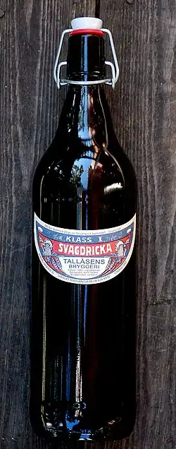 Svagdricka, (lit. 'weak drink' in Swedish) is a form of sweet, dark, low-alcohol (less than 2.25% ABV) malt beverage or small ale. In the early 20th century, there were local producers of svagdricka all over Sweden, but in recent decades its popularity has dwindled.[1] It is top fermented, unpasteurized and resembles Russian kvass. It is one of the two old Swedish brews that has survived into modern times, the other one being gotlandsdricka.[2] There are only a few manufacturers left and their production volumes display great seasonal fluctuation with peaks around Christmas and Easter when it is consumed with traditional Swedish food,[3] although eclipsed in popularity by julmust.