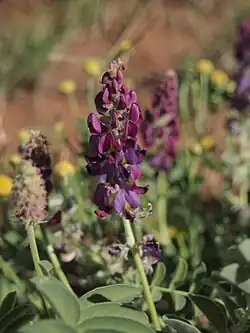 Swainsona canescens, commonly known as grey swainsona,[2] is a flowering plant in the family Fabaceae. It is a small perennial herb with pink-purple or purple, yellow and green flowers and grows in Queensland, Western Australia and South Australia.
