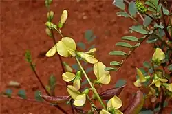 Swainsona laxa, the skeleton pea,[2] yellow swainson-pea, yellow Darling pea,[3] or sandhill swainsona,[4] is a species of flowering plant in the family Fabaceae and is endemic to inland Australia. It is an erect, shrublike herb, often appearing leafless, sometimes with 13 to 17 broadly egg-shaped leaflets, and racemes of 15 to 20 usually yellow flowers.