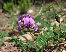 Swainsona lessertiifolia, commonly known as coast swainson-pea, bog pea, Darling pea poison pea or poison vetch[2] is an erect or ascending perennial herb in the pea family and is endemic to south-eastern Australia. It has 13 to 21 narrowly elliptic to elliptic leaflets, and racemes of mostly 12 to 25 usually purplish, rarely white flowers.