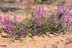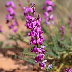 This species of pea grows in sandy soils on sandplains and sand hills, and is found in all mainland Australian states and the Northern Territory. In Victoria, it is mainly restricted to the far north-west of that state.[2] In New South Wales, it is found on the western slopes and plains.[4] In Western Australia it is widespread in inland areas.[3] In South Australia, the species is widespread in scattered areas[6] and in the Northern Territory it occurs in the south.[9]