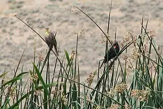 ![]() A molting male yellow-headed blackbird and a male red-winged blackbird perch among the reeds. Birding is a main attraction of the Swan Lake Nature Study Area. | |