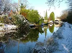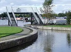 A bridge and a lock on the Llangollen Canal are also listed at grade II. Swanley Bridge is a brick road bridge carrying Springe Lane across the canal near the junction with Swanley Lane; it dates from around 1793.[10] Just north of the bridge lies Swanley Lock Number 2, which dates from 1805. The lock is in blue-and-red brick with stone copings, and is by J. Fetcher, with Thomas Telford as the engineer.[11] Swanley Bridge Marina, immediately north of Lock Number 2, opened in 2006; it has 315 berths.[12] South of Swanley are the unlisted Butcher's Bridge, a footbridge, and Swanley Lock Number 1.[1][4]