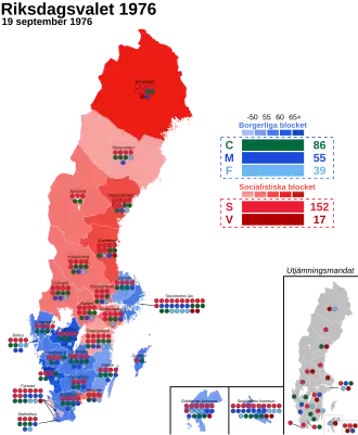 General elections were held in Sweden on 19 September 1976.[1] Although the Swedish Social Democratic Party remained the largest party, winning 152 of the 349 seats in the Riksdag,[2] a coalition government was formed with the Centre Party, the People's Party and the conservative Moderate Party (who won a combined 180 seats), which formed Sweden's first non-socialist government since 1936. Centre Party leader Thorbjörn Fälldin, who had widely been expected to take over the government in the previous election of 1973 (which turned out to bring a 175-175 draw between the left and right blocs), was appointed prime minister, the first not from the Swedish Social Democratic Party since Axel Pehrsson-Bramstorp's brief interregnum 40 years earlier.
