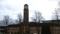 The architectural centrepiece of the town is the neoclassical Salford Civic Centre, which has a 125-foot (38 m) high clock tower.[18] It was built as Swinton and Pendlebury Town Hall, when Swinton and Pendlebury received its Charter of Incorporation. Before its construction, council meetings were held in Victoria House in Victoria Park, but the borough council required larger premises. A competition was launched to design the new town hall; the winners were architects Percy Thomas and Ernest Prestwich with a design that closely resembled Swansea Guildhall. It later won the RIBA Gold Medal.[19]