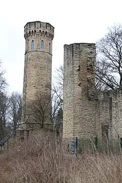 Close to the ruins of the Hohensyburg the Vincke tower (Vincketurm) in neogothic style was erected (total height: 26 m (85 ft)) in 1857 and renewed in 1882 in honour of Ludwig von Vincke, the first Supreme president of the Prussian Province of Westphalia. Vincke had a special relation to this place, for his first wife Eleonore von Syberg was a descendant of the Lords of Syberg and owner of the castle ruins.