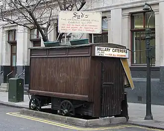 The coffee stall was established in a working-class part of the city but struggled with the gentrification of the area which brought new coffee bars.[4][1] After the stall celebrated its 100th anniversary Jane Tothill announced that falling trade had forced its closure and it closed for the final time on 20 December 2019.[1][2] Tothill also announced that she was donating the stall to the Museum of London.[1] Hackney London Borough Council will assist with the relocation of the stall which will have conservation work carried out on it before going on display at the Museum of London's new premises in the former Smithfield Market from 2024.[1][3] The curator of social and working history at the museum said that the stall is "an invaluable piece of our shared history as Londoners".[1] The carriage was removed from the street on 11 January 2020.[5]