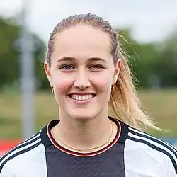 She made her debut for the senior national team on 10 November 2018 in Osnabrück in a 5–2 win in a friendly against Italy, coming on for Lina Magull in the 71st minute.[9] She scored her first international goal on 22 September 2020 in the seventh European Championship qualifier in Group I in a 3–0 win against Montenegro, scoring the final goal in the 59th minute.