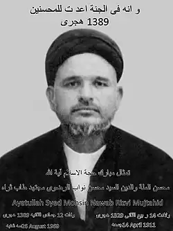 Grand Ayatollah Syed Mohsin Nawab Rizvi (14 April 1911 – 26 August 1969; Arabic: ﺁيت الله العظمى سید محسن نواب رضوی) popularly referred to by his followers as Mohsin-ul-millat, was an Indian poet, writer, speaker and a Marja of the Twelver branch of Shia Islam. He served as vice principal of Sultanul Madaris, Lucknow, and as a principal of Govt Oriental College Madarsa Alia, Rampur and Madarsa Imaniya Nasiriya, Jaunpur.[1]