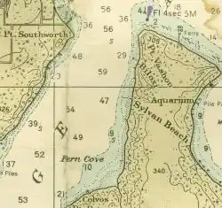 Sylvan Beach is noted on navigational charts probably because of the old pilings which extend 100 yards out into Colvos Passage. The piles are all that remains of a dock that served the Virginia V, the passenger-only, mosquito fleet, steamship ferry, that ran daily from Tacoma to Seattle.