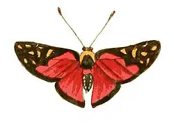 Upperside. Antennae black. Front of the head yellow. Thorax black, with two yellow streaks at the base of the wings. Abdomen dark brown. Half of the superior wings black, beginning at the shoulders, and running to the external edges, on which are seven cream-coloured spots variously shaped. The other half of these wings is scarlet, without any marks. Posterior wings entirely scarlet, edged with black.