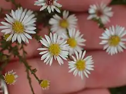 Each flower head is made up of ray florets (petals) and disk florets (disks are the flower centers). There are 16–20 ray florets (sometimes as few as 12) which are usually white, but may rarely be pink. The ray florets are 5–8 mm long and 0.5–1.2 mm wide. Ray florets in the Symphyotrichum genus are exclusively female, each having a pistil (with style, stigma, and ovary), but no stamen. Thus, ray florets accept pollen and each can develop a seed, but they produce no pollen.[7]