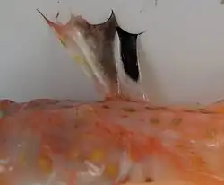 Synchiropus phaeton is a relatively small animal with a sexual dimorphism in size where the male fish generally are larger than the female fish. Male fish grow up to 10–14 cm with a maximum total length of 18 cm reported. Female fish can grow up to 12 cm with 6–10 cm being common although sizes greater 20 cm are reported.[4] They are characterized by their big eyes which are sitting inside the skull and an extraordinary spiny structure on the top of their gill cover (preopercular spine). Their body has an orange or red colour dorsally with yellow to olive patches on their skin. The belly colour can vary from pinkish to silvery. The dorsal fin has a black blotch between the third and fourth spine, whereas the anal fin has a black streak or margin.[5]