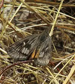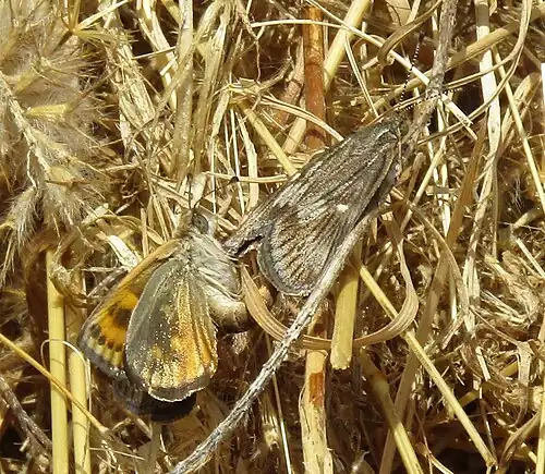 The forewing uppersides are predominantly brown, with a whitish spot in the middle.[4] The forewing undersides are mostly dull orange with a row of small black spots near their outer edges.[4] The hindwings are dull orange on the uppersides, with a row of brown spots near the outer edges.[4] They have a brownish inner area that encloses a dull orange spot.[4] The undersides of the hindwings are brownish-black with orange for the male, and grey with orange for the female.[4] She also has a row of black spots near the edges of her hindwing undersides.[4] The species has dark and pale forms.[3]