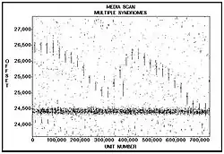 One of the earliest uses of 2D Error Mapping was applied to the recorded errors from a transverse-scan digital tape recording device made by Ampex Corporation. The accompanying Media Scan image demonstrates that error locations are key to recognizing that multiple error-producing syndromes are occurring simultaneously and affecting the total bit error rate experienced during the test recording session.
