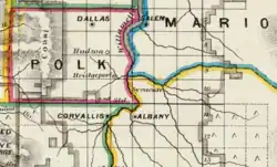 Syracuse was founded by Kentucky native Milton Hale, a pioneer who came to the Oregon Country on the Oregon Trail from Burlington, Iowa in 1845.[3][2] He established a ferry on the Santiam River downstream from what is now Jefferson.[3] Hale's Ferry became an important crossing point for the expansion of Oregon Trail settlers into Linn and Lane counties.[2] The town of Syracuse was on his land claim on the south bank of the river.[3] Syracuse post office was established in 1850, with Jacob S. Conser as the first postmaster.[3] In 1852, the post office moved, and the name was changed to Santiam City, a rival city founded by Samuel S. Miller on the north bank of the river in Marion County.[1][3] Syracuse and Santiam City eventually lost business to Jefferson, which was founded by Jacob Conser.[3] Santiam City post office was moved and renamed Jefferson in 1861.[3]