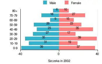 According to the 2002 Poland census, there were 436 people residing in Szczeka village, of whom 49.1% were male and 50.9% were female. In the village, the population was spread out, with 26.6% under the age of 18, 34.2% from 18 to 44, 21.1% from 45 to 64, and 18.1% who were 65 years of age or older.[1]