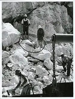 Quarrying began at Kairuru (on the southeastern, Nelson side of the hill) in the early 1900s,[3] and in 1911[4] was chosen for use in Wellington’s Parliament Buildings.[1] No blasting was involved in getting the marble.[2]The heavy marble blocks for the parliament were transported via a tramline down a steep hillside for 10.4 kilometres (6.5 mi) to Mārahau, where they were loaded onto scows, to be taken to Wellington for cutting.[2] A total of 5000 tonnes of marble had been quarried at Kairuru by the time of completion of the Parliament Buildings in 1922.[3]
