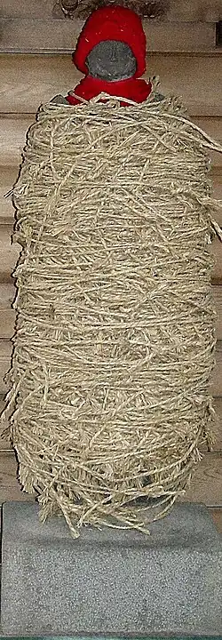 In The Case of the Bound Jizo or Suspect Statue, Ōoka Tadasuke was called upon to discover the thief of a cartload of cloth from a local kimono maker. Ōoka ordered a statue of Jizo of the Narihira-san Tōsen-ji, a temple in Tokyo, to be bound and brought forth to be called to answer for dereliction of its custodial duty. When the bound statue arrived in the courtroom, the spectators burst into laughter. Ōoka sternly ordered each spectator to be punished with a token fine for their outburst. Each was ordered to provide a small swatch of cloth as a fine. When the spectators paid their fines, the robbed kimono maker identified the piece of cloth from one spectators as identical to the cloth stolen in the crime. The spectator, who was the actual thief, was arrested, and Ōoka ordered the Jizo statue released as having discharged his duty. In 1925, the statue was removed from downtown Tokyo to a little temple called Nanjo–in on its outskirts. The statue still stands, and is wrapped in rope tied by hopeful victims of thieves. However, the statue is worn almost smooth because of over 200 years of binding.