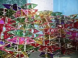 Children's toys in Tết Trung Thu are made of paper and shaped like creatures such as butterflies, mantises, elephants, horses, unicorns, lions, dragons, deer, shrimps, and fish. During the evenings of the festival, children play tug and catch, and have a procession of lanterns, lions, drums, and Thanh la, a percussion instrument.[5]