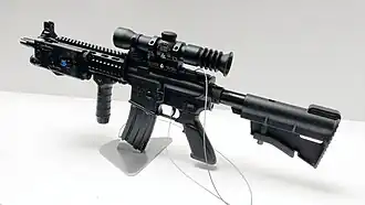 ![]() The T91CQC carbine. Note the forend with integrated rails and the shorter barrel compared to the standard variant. | |