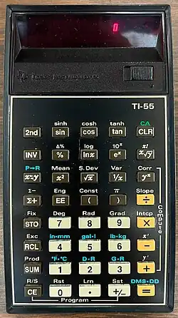 The TI-55 is a programmable calculator first manufactured by Texas Instruments in 1977. It has an LED display,[1] and weighs 6.4 ounces (180 grams). It is programmable to hold up to 32 key-codes that allow the user to repeat simple calculations with different values.[2]