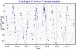 Thomas David Anderson discovered that T Andromedae is a variable star, in 1894.[7] The next year, Edward Charles Pickering examined archival photographic plates to derive a light curve for the star, and calculated a period of 281 days.[8]