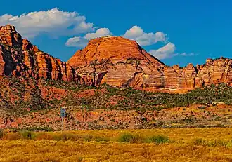 Tabernacle Dome is a 6,430-foot (1,960 meter) elevation summit located in Zion National Park, in Washington County of southwest Utah, United States.[3] Tabernacle Dome, a formation composed of Navajo Sandstone, is situated at the southeastern end of Cave Valley, 10 mi (16 km) northwest of Springdale, Utah. Its nearest higher neighbor is Cave Knoll, 1.6 mi (3 km) to the north-northwest.[1] Other neighbors include South Guardian Angel, 1.9 mi (3 km) to the east, and North Guardian Angel, 2.2 mi (4 km) to the northeast. Precipitation runoff from this mountain drains into tributaries of the Virgin River. Access to this peak is via the Kolob Terrace Road. This peak's name was officially adopted in 1934 by the U.S. Board on Geographic Names.[3] It is named for its resemblance to the Mormon Tabernacle in Salt Lake City.[4]