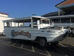 The DUKW ("Duck" or "duck boat") is a wheeled amphibious vehicle used by the United States military and its allies during the later years of World War II and the Korean War.[8] The vehicles became available in surplus after the Korean War, and a veteran in Minnesota began a business giving rides aboard the vessels to tourists on the Wisconsin River. Over the last 50 years, the practice has expanded to other areas. Several major tourist destinations in the United States feature duck boat tours, including Austin, Boston, Pittsburgh, Philadelphia, and Washington, D.C.[9]
