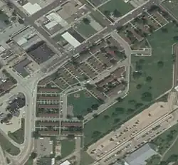 The Taft Homes, named after Ohio senator Robert A Taft, were originally built in 1952 as a temporary means of shelter for veterans returning from the Korean War.[1][2] The buildings soon transitioned to low income housing and during the 1960s and 70s the housing project saw multiple violent riots. In 1968 ten police officers and a reporter were wounded after a minor incident turned into a race riot that lasted for around 3 hours.[3][4] A second major race riot occurred in 1970 after the police evicted two female residents from the Taft Homes; resulting in rioting that spread throughout other public housing projects in the city.[5] In 1996 all 220 units in the complex underwent comprehensive rehabilitation efforts by the city; the units received new siding, flooring and plumbing in order to make the buildings more energy efficient.[1] The renovation efforts also added, and updated parking, lighting, sidewalks as well as various landscaping work.[1] During its modernization effort the Housing Authority decided to demolish the 15 buildings closest to the river, that were known for illicit activities.[1] The United States Marine Corps, U.S. Navy Seabees and Illinois Air National Guard helped in the demolition effort.[1]