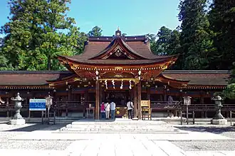The foundation of Taga Taisha is unknown. It is mentioned in the ancient Kojiki and Nihon Shoki chronicles from 712 AD.[1] The shrine's legend connects it with the legendary hero Yamato Takeru, whose son, Inugami no Mitasuki was sent as an emissary to Sui China in 614 AD and the first Japanese embassy to Tang China in 630 AD. He was also the ancestor of the Inukami clan, from which Inukami District, Shiga (where the shrine is located) takes its name. However, in the 914 AD Engishiki records, it is listed only as a small shrine. From the Heian period it was revered as having efficiency for childbirth, vocational aid, fire extinguishing and longevity. During the Muromachi period, as pilgrimages to the Ise Grand Shrine and the Kumano Sanzan gained in popularity, pilgrims were encouraged to visit Taga Shrine as part of the route. In the Sengoku period, Toyotomi Hideyoshi had a strong faith in this shrine and frequently prayed for an extension of his mother's life. He donated 10,000 koku, or the equivalent revenue of one year for a daimyō for its reconstruction and upkeep.[1]