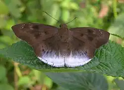 Tagiades, commonly known as snow flats, is a genus of spread-winged skipper butterflies. It is the type genus of the tribe Tagiadini of the subfamily Pyrginae in the family Hesperiidae. It contains seventeen species; three of which are found in tropical Africa, while fourteen are found from India, Sri Lanka, Southeast Asia, northeast Australia, to the Pacific Islands. They are primarily diurnal butterflies, and can usually be found in secondary forests at up to 1,300 m (4,300 ft) above sea level. They can sometimes be encountered in partially cleared or cultivated areas. They are fast flyers, flying at an average height of 2 to 6 m (6.6 to 19.7 ft). They usually rest on the undersides of leaves. When disturbed they will fly away but will usually return to the preferred area, often to the same leaf.[2]
