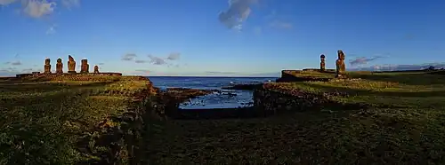 The Tahai Ceremonial Complex is an archaeological site on Rapa Nui (Easter Island) in Chilean Polynesia. Restored in 1974 by American archaeologist William Mulloy, Tahai comprises three principal ahu from north to south: Ko Te Riku (with restored eyes), Tahai, and Vai Ure. Visible in the distance from Tahai are two restored ahu at Hanga Kio'e, projects that Mulloy undertook in 1972. Like other Mulloy restoration projects at Ahu Akivi, the ceremonial village of Orongo and Vinapu, the ceremonial center at Tahai now constitutes an integral part of the Rapa Nui National Park, designated by UNESCO as a World Heritage site.