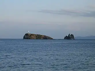 Taijima is a set of two islands located about 1 kilometer (0.62 mi) off the coast of the Shimokita Peninsula in Mutsu Bay. Administratively, the islands are part of the former village of Wakinosawa that is now part of the city of Mutsu. During the village's existence, the island was often used a symbol of the municipality.[1] The name Taijima is derived from the islands' appearance of a Red seabream swimming along the surface of the water. The islands are referred to as the body and tail of the fish. The body island is covered with green, but the tail is stained white from the droppings of seabirds on its steep rocky surface. The waters surrounding Taijima are designated as a protected marine park.[2] In addition to this marine park, the islands are included in the larger prefecture-managed, Shimokita Hantō Quasi-National Park.[3]
