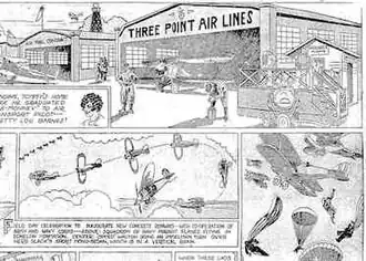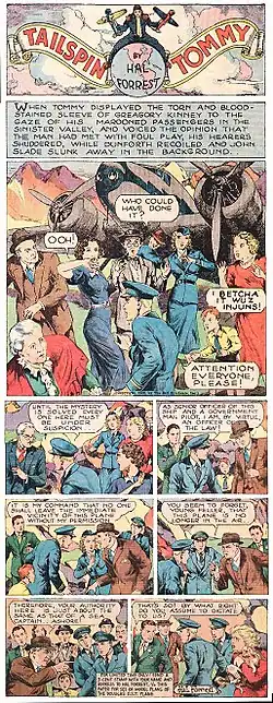 Tailspin Tommy was an aviation-adventure comic strip about a youthful pilot, "Tailspin" Tommy Tomkins (sometimes spelled Tompkins). Originally illustrated by Hal Forrest and initially distributed by John Neville Wheeler's Bell Syndicate and then by United Feature Syndicate, the strip had a 14-year run from May 21, 1928 to March 15, 1942.[1]