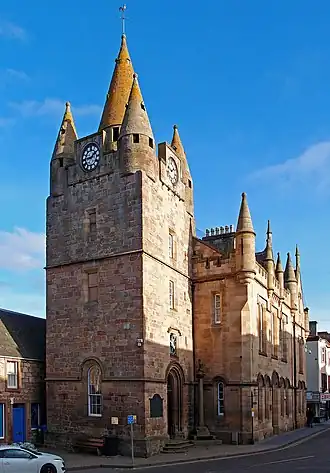 The current tolbooth was designed by Alexander Stronach in the Scottish baronial style, built in coursed stone and was completed in 1708.[4][5][6] The design involved a three-stage tower facing onto the High Street. The tower contained small sash windows in the second and third stages. The tolbooth was accompanied by a two-storey council house, extending southeast along the High Street, which was also completed in 1708. The upper part of the tolbooth was enhanced by the addition of corner bartizans and a spire in 1733. The bell, which had been recovered from the old tolbooth, was installed in the third stage of the tower in 1733 and a clock was installed there in 1750.[1]