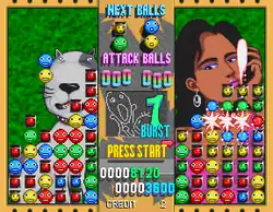 The gameplay is similar to Puyo Puyo. The player must beat the opponent by creating combos, which involve matching three balls or more of the same color simultaneously. Doing so will fill the opponent's side with colored blocks from either the top or bottom. The blocks contain a certain ball color, depending on the color of the block. When blocks are matched, the color ball is released. The side that exceeds the top first loses. Score is also added for both sides, but the opponent's score doesn't affect the rounds in any way.