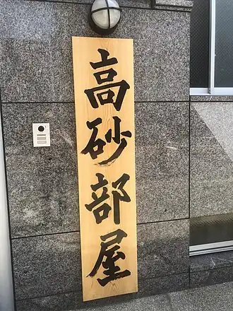Takasago stable (髙砂部屋 or 高砂部屋, Takasago-beya) is a stable of sumo wrestlers, one of the Takasago group of stables. It is correctly written in Japanese as "髙砂部屋", but the first of these kanji is rare, and is more commonly written as "高砂部屋".