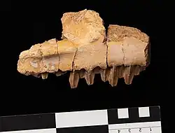 The Taleta holotype belongs to a small-bodied hadrosaurid, or 'duckbilled' dinosaur. As preserved, the incomplete right maxilla is 12.5 cm (4.9 in) long and includes sixteen alveoli (tooth sockets), but may have been up to 17.5–8 cm (6.9–3.1 in) when complete with 25 alveoli. The left maxilla is less complete, at 8 cm (3.1 in) long, generally overlapping with its right counterpart. The holotype is similar in size to the coeval Ajnabia and Minqaria, the latter of which has been estimated at 3.5 metres (11 ft) long.[2] The bone texture on the maxilla suggests that the holotype likely belongs to a mature individual. While the maxilla of Taleta demonstrates anatomical features comparable to both of its contemporaries, it also has several unique traits that support its distinction. Most notably, the teeth are particularly large, presumably leading to a reduced tooth count in the upper jaw.[1]