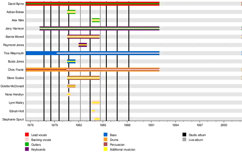 • David Byrne – lead vocals, guitar, keyboards, percussion (1975–1991, 2002)