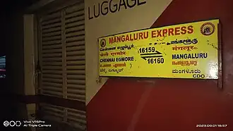 Some of the prominent stoppages include Chengalpattu Junction, Viluppuram Junction, Vriddhachalam Junction, Tiruchirappalli Junction, Karur Junction, Erode Junction, Coimbatore Junction, Palakkad Junction, Shoranur Junction.[4] This daily express train departs Tambaram as Train No.16159, arrives at Tiruchirappalli Junction the next morning,[10] reverses the loco and leaves for Mangalore Central and arrives the destination after dusk of same day.[11] On the return journey, the train departs Mangalore Central as Train No.16160 just after dawn, arrives Tiruchirappalli Junction same night,[12] reverses the loco and leaves for Tambaram, and arrives the destination next morning.[13][b]