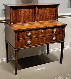 A tambour desk is a desk with desktop-based drawers and pigeonholes, in a way resembling bureau à gradin. The small drawers and nooks are covered, when required, by reeded or slatted shutters, tambours, which usually retract in the two sides, left and right. It is a flatter and "sideways" version of the rolltop desk.