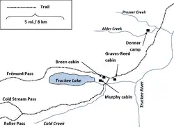 Over the course of the journey, some families in the Donner Party moved faster than others, resulting in the group separating into smaller sections.[29] The two Donner families lagged to the rear of the party at large, and after a heavy snowstorm they were left seven miles behind the rest of the party at Alder Creek.[30] Tamsen Donner wanted to continue onward into the mountains but was overruled by George and Jacob Donner, who decided to set up camp at Alder Creek.[30] While stuck, Donner would brush her daughters' hair daily while telling them Bible stories.[31] She also wrote, sketched, knit, and sewed, all while telling her daughters the stories "of 'Joseph in Egypt,' of 'Daniel in the den of lions,' of 'Elijah healing the widow's son'".[32] Donner's daughter, Georgia, later recalled of this time that Tamsen had said "that we children had not had a dry garment on in more than a week, and that she did not know what to do about it".[33]